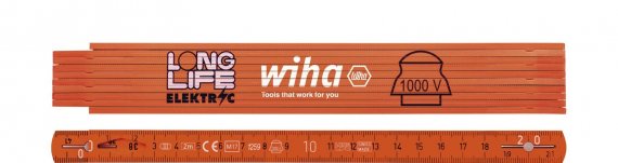 Складной метр Longlife Elektric 42068 фирмы Wiha - профессиональный измерительный инструмент. Складной метр из 10 звеньев длиной 2 метра из армированного стекловолокна полиамида устойчив к царапинам и сгибанию, водостойкий и не чувствительный к воздействию химикатов прослужит долгие годы. Удобная и надежная фиксация звеньев под углом 90°. Износостойкий, нечувствительный к грязи шарнир без люфта с пружинным стержнем. Флуоресцентное покрытие светится в темноте, что позволяет работать в условиях слабого освещения или его отсутствия. Выдавленное черное деление шагами по 1 мм, выдавленные белые числа десятков, разметка под врезку 3 подрозетников. Встроенный ретрактор для кабелей 3-7 мм.